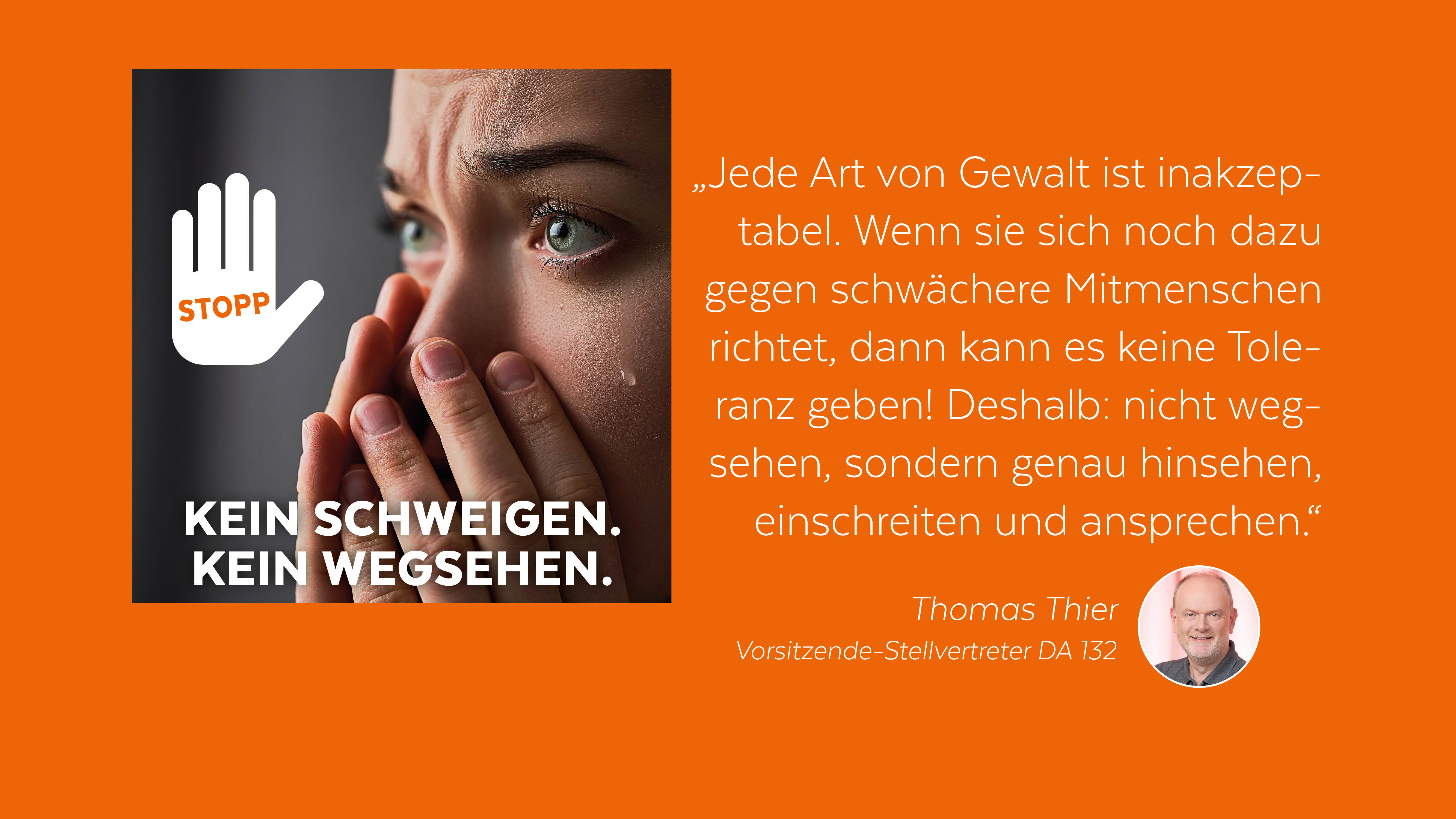 „Jede Art von Gewalt ist inakzeptabel. Wenn sie sich noch dazu gegen schwächere Mitmenschen richtet, dann kann es keine Toleranz geben! Deshalb: nicht wegsehen, sondern genau hinsehen, einschreiten und ansprechen.“